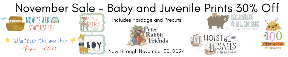 Our November sale is 25% off our baby and juvenial prints - yardage and precuts! A little sale for the little ones in your life. Shop HERE.